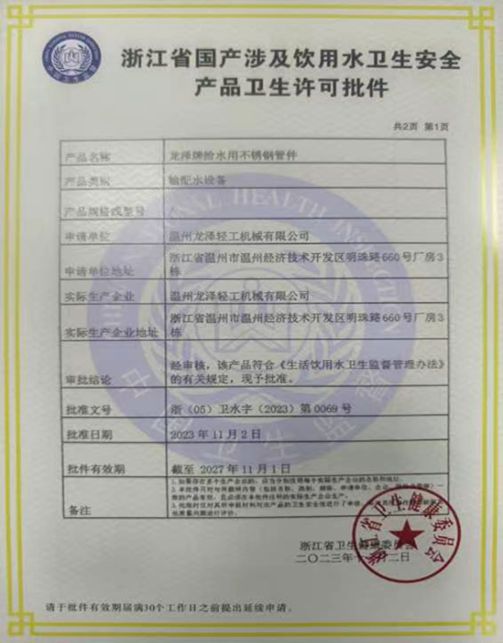 浙江省科技型中小企業溫州市科技(創新)型企業溫州經濟開發區區級科技型企業高新技術企業證書食品制藥機械行業信用A級企業流體設備十大知名品牌榮譽證書2023年度制藥機械行業科技型企業50強2023年度制藥機械行業高質量發展企業20強安全生產標準化三級企業榮譽證書止回閥實用新型專利證書直通視鏡實用新型專利證書手動換向閥實用新型專利證書人孔蓋實用新型專利證書氣動球閥實用新型專利證書卡箍式球閥實用新型專利證書高密封球閥實用新型專利證書蝶閥實用新型專利證書產品質量信息浙江省國產涉及飲用水衛生安全產品衛生許可批件